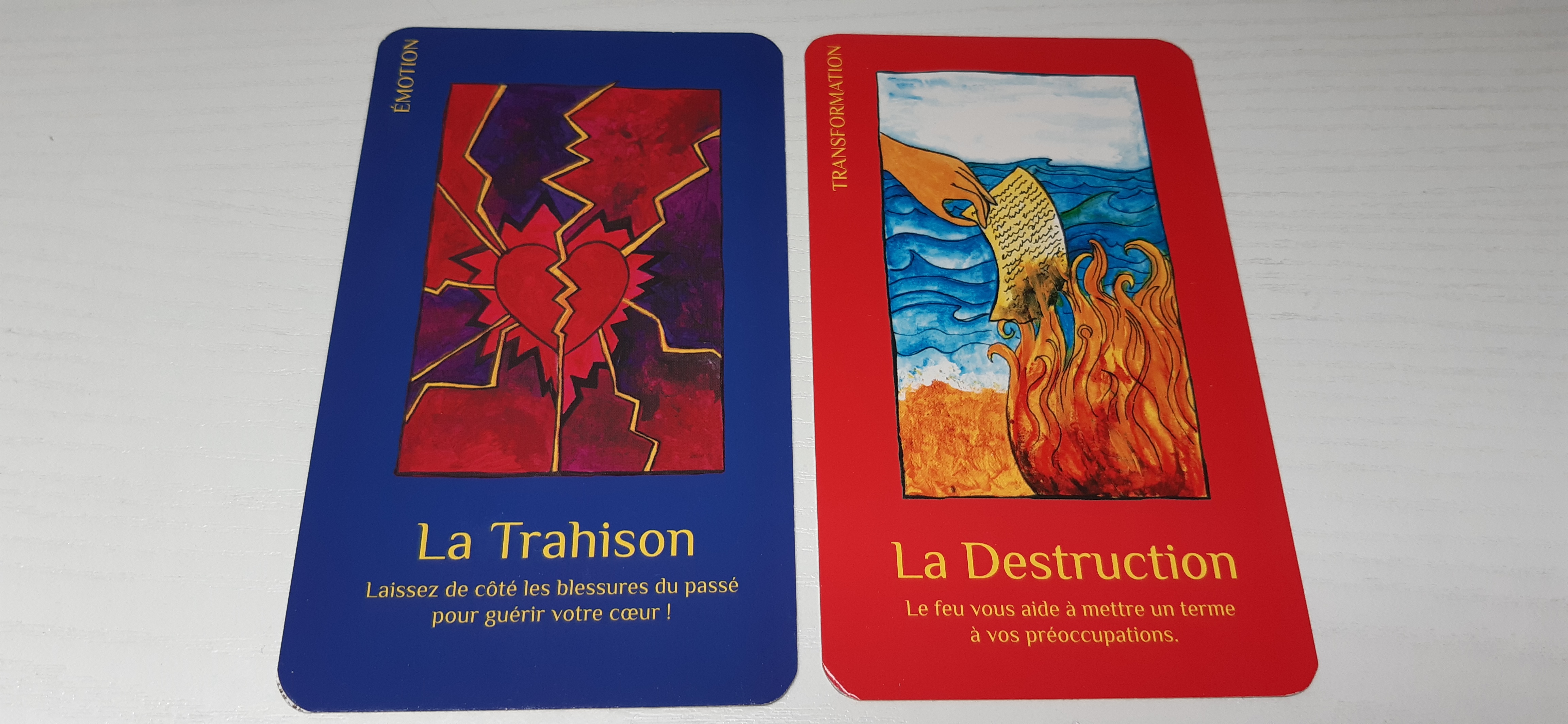 En ce qui concerne la carte de la Destruction, elle mentionne que le feu peut mettre un terme aux préoccupations et aux blessures, symboliquement. Le Feu purifie, transmute et libère.