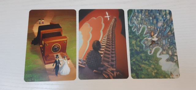 Sur la première carte, deux enfants s’apprêtent à entrer dans un gigantesque appareil-photo, puis en ressortent, main dans la main, mûris par l’expérience et unis par les liens du mariage.