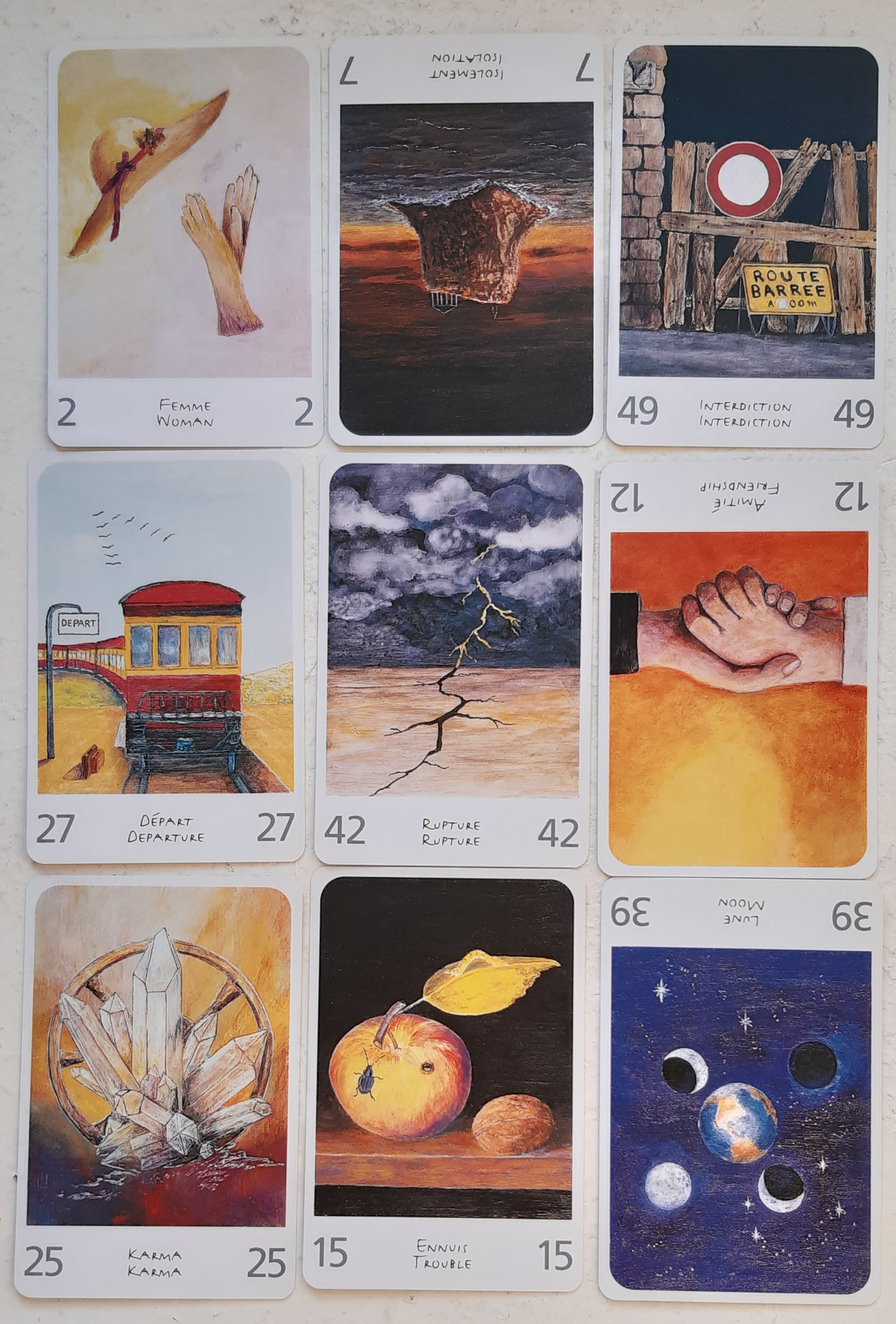 Ce tableau montre une idée de rupture, de bouleversement total dans votre vie, et la carte de la FEMME en haut à gauche s’adresse plus particulièrement à des personnes de polarité féminine. Je veux dire par-là que vous pouvez être un homme dont l’énergie féminine est plus développée ; c’est-à-dire que vous avez naturellement des qualités d’introspection, de compassion, de créativité, de spiritualité et d’intuition, pour les principales d’entre elles.