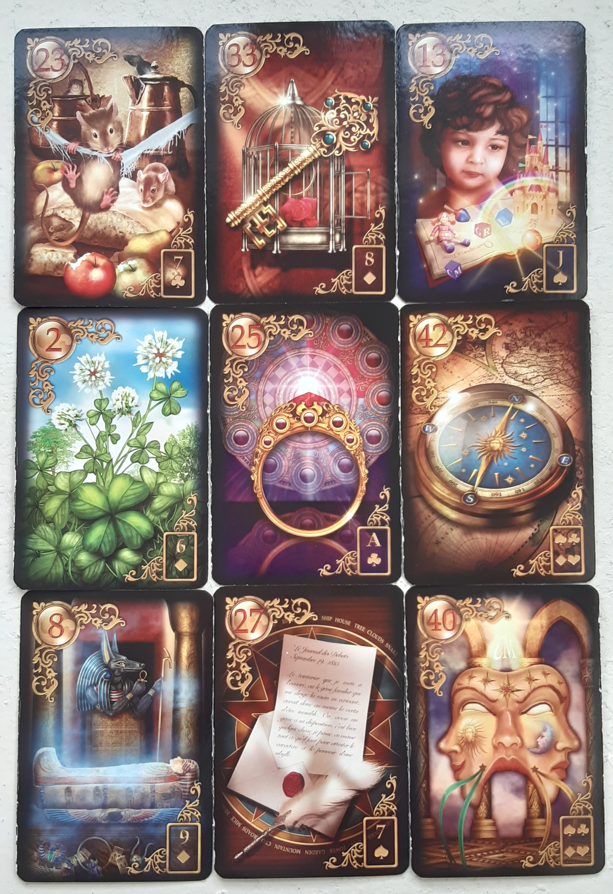 Les difficultés de vie, le stress et l’anxiété, ainsi que la précarité (La SOURIS) qui étaient pour beaucoup profondément déstabilisantes jusqu’à présent vont connaître un essor, une amélioration et se transformer en abondance (Le TRÈFLE). La carte du CERCUEIL parle de la fin de cette situation soumise au manque de liberté et à la restriction.