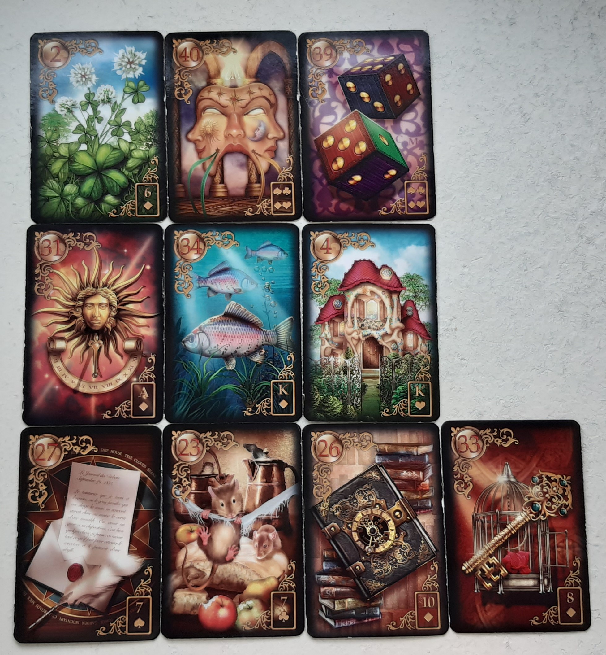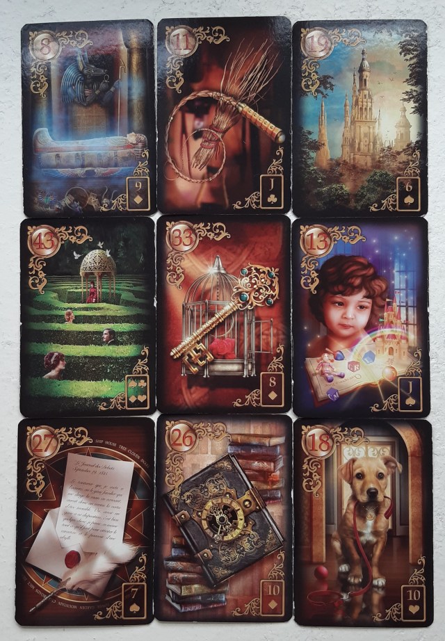 Le CERCUEIL – La VERGE – La TOUR – Le LABYRINTHE – La CLÉ (et oui, la voici de nouveau, notre sauveuse, et au centre du tableau qui plus est !) – L’ENFANT – La LETTRE – Le LIVRE (eux aussi, et côte à côte, cette fois-ci !) – Le CHIEN