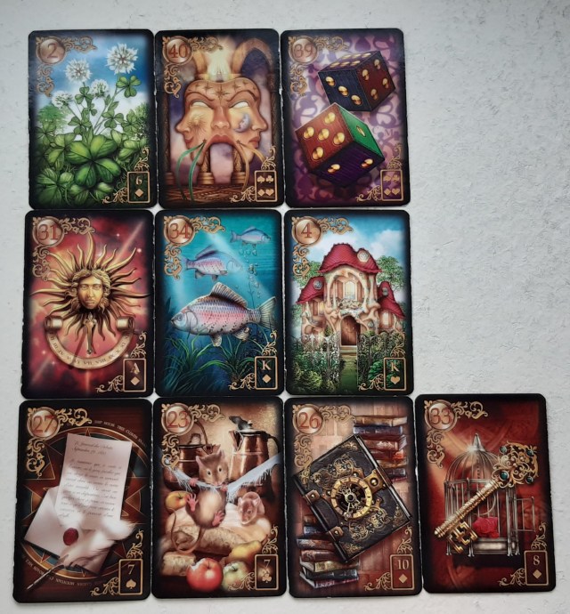 Le TRÈFLE – Le MASQUE – Le DÉ – Le SOLEIL – Le POISSON – La MAISON – La LETTRE – La SOURIS – Le LIVRE + La CLÉ