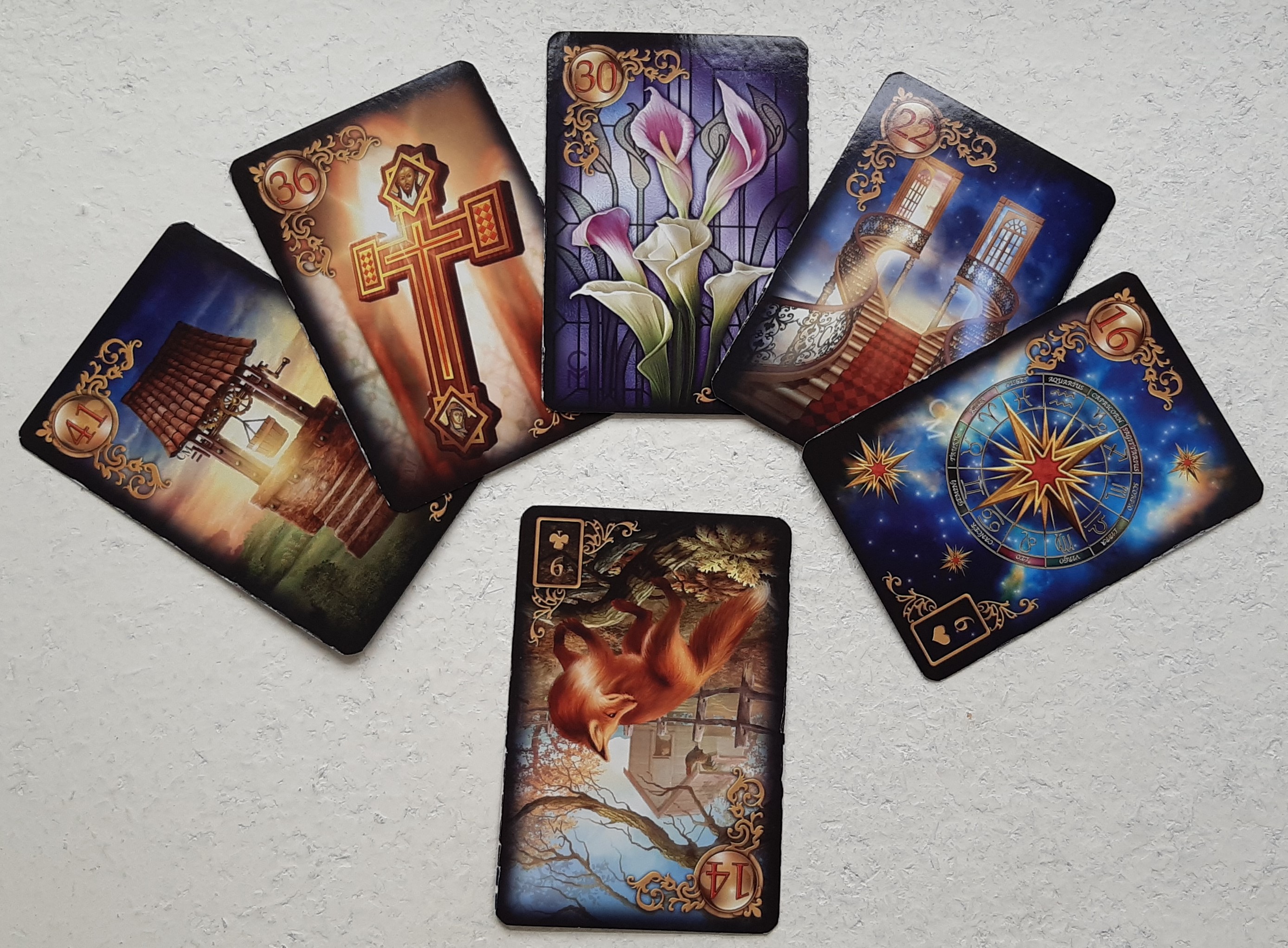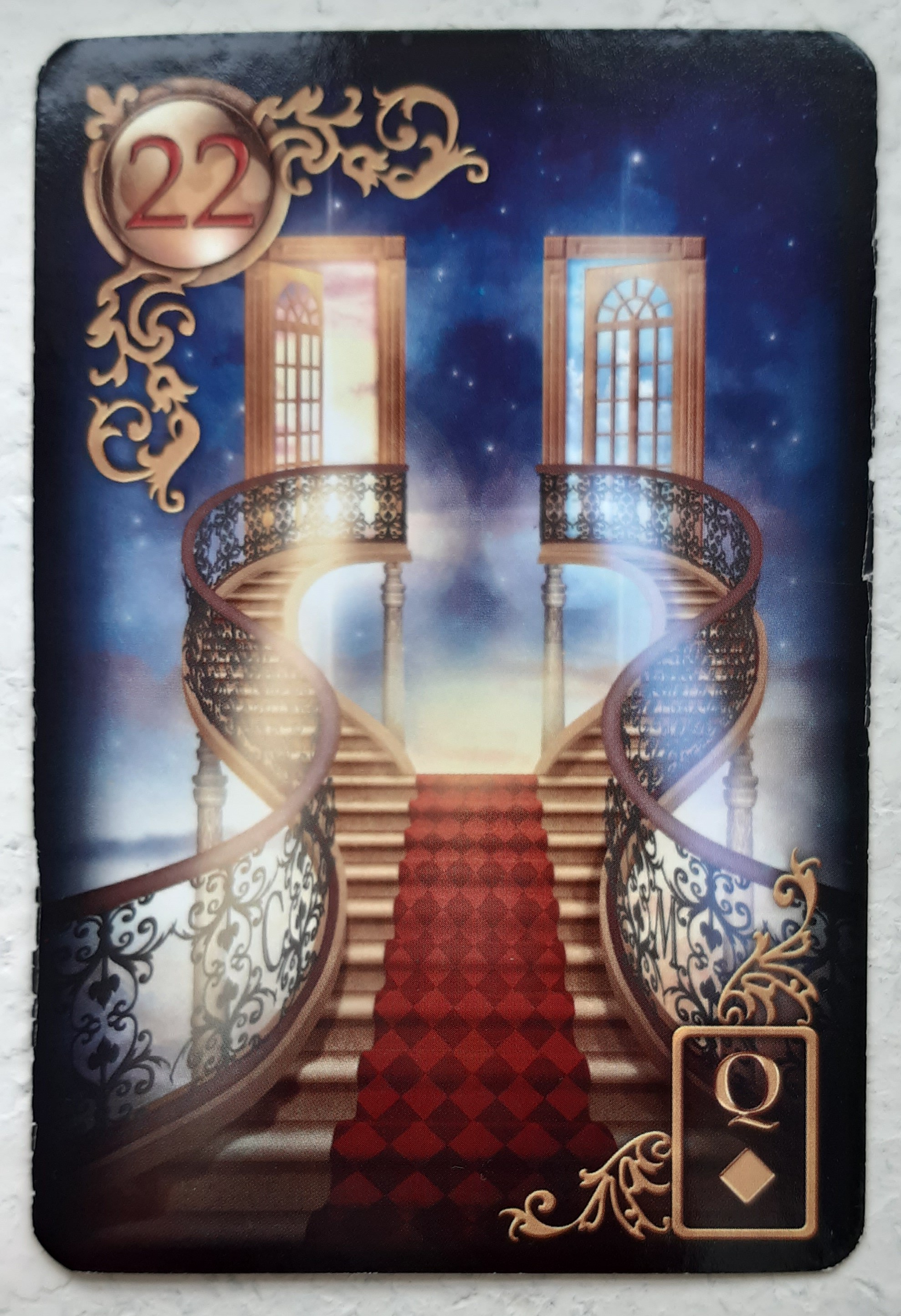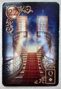 Oh là, lorsque j’ai rangé les cartes, il y en a une qui est tombée ! Je ne l’avais pas vue, elle était restée collée derrière : et c’est la carte de l’ESCALIER, qui nous dit que, oui, un choix, une décision va devoir être prise afin de gravir un niveau supérieur dans nos existences !